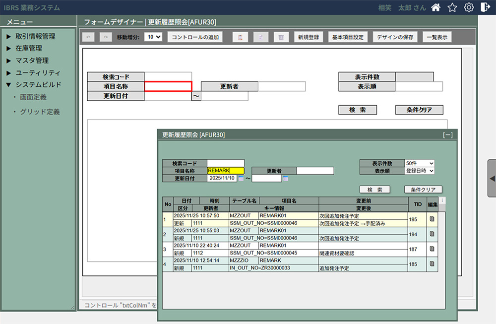 画面レイアウトはシンプルな台帳形式に加えて、ヘダー部/明細部から構成される伝票形式に対応することが可能です。別途グリッド形式で明細1行を複数段表示するなど、用途に応じてより視認しやすい画面を構築できます。